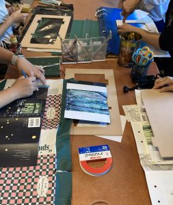 課題図書にインスピレーションを得た紙を持参いただき、みなさんでブックカバーを制作しました。制作後は、なぜその紙を選んだのか、本の内容のどこからそのアイデアが出たのか、をお茶を飲みながらひとりずつお話をいただきました。とても楽しく温かな時間を皆様に作っていただきました。深川えんみちの皆様、エンミチ文庫の皆様、どうも有難うございます。